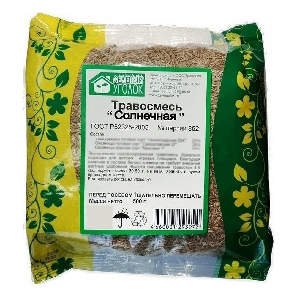Зеленый Уголок Семена газона Солнечная, 0,5кг 4660001293977 - травосмесь идеально подходит для создания лугового газона на солнечных и засушливых участках. Высота скашивания 4-8 см, норма высева 3-5 кг на 100 м2.