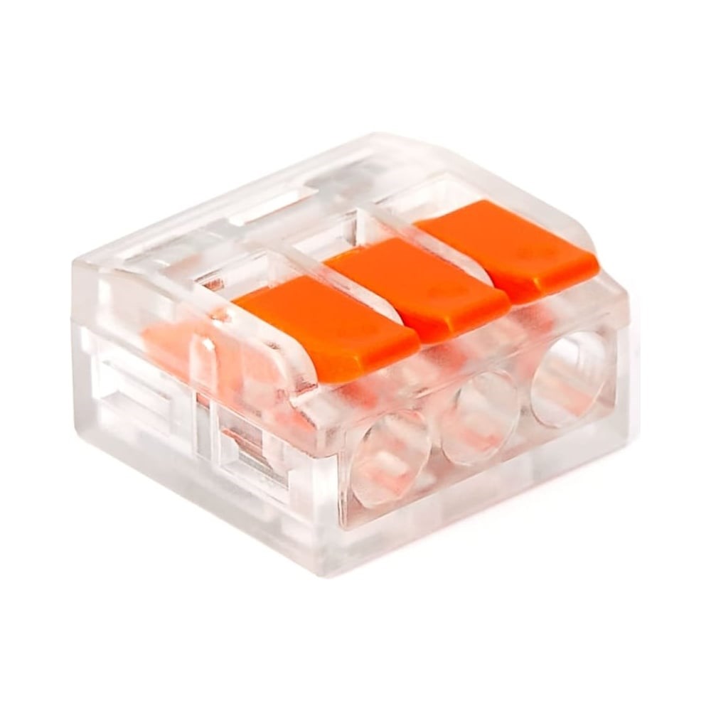 Трехпроводная клемма Gigant 20 шт/уп 0,08-2,5(4)мм² GCT-221-413-20 предназначена для быстрого и надёжного соединения медных проводников в распределительных коробках, щитах и электроустановочных изделиях. Используется в сетях переменного и постоянного тока напряжением до 600 В с номинальным током до 32 А. Подходит для профессионального и бытового электромонтажа. Клеммы серии 221 обеспечивают соединение однопроволочных и многопроволочных проводников различного сечения в одной клемме: — многопроволочные: 0,14–4 мм²; — однопроволочные: 0,2–4 мм². Рабочая температура окружающей среды — до +85 °C. Рекомендуемая длина зачистки изоляции — 11 мм. Применяются при монтаже осветительных линий, розеточных групп, распределительных коробок, подключении оборудования, а также при ремонте и модернизации электропроводки. Преимущества: Прозрачный корпус позволяет визуально контролировать правильность вставки и глубину захода проводника. Возможность сочетания проводников разного типа и сечения в одной клемме — удобно при реконструкции и подключении нового оборудования к существующей проводке. Пружинный зажим из нержавеющей стали обеспечивает стабильное контактное давление и исключает ослабление соединения со временем. Медный контакт с гальваническим покрытием гарантирует низкое переходное сопротивление и устойчивость к нагреву. Корпус выполнен из полимерного материала, соответствующего классу пожарной безопасности UL 94 V0 — не поддерживает горение и самозатухает при устранении источника пламени. Детали изготовлены из армированного стекловолокном полимера — повышенная прочность и устойчивость к механическим нагрузкам. Быстрый монтаж без инструмента: провод вводится в зажим без чрезмерных усилий и надёжно фиксируется без риска выпадения. Российское производство полного цикла с автоматизированной сборкой и контролем качества — стабильность параметров каждой партии.