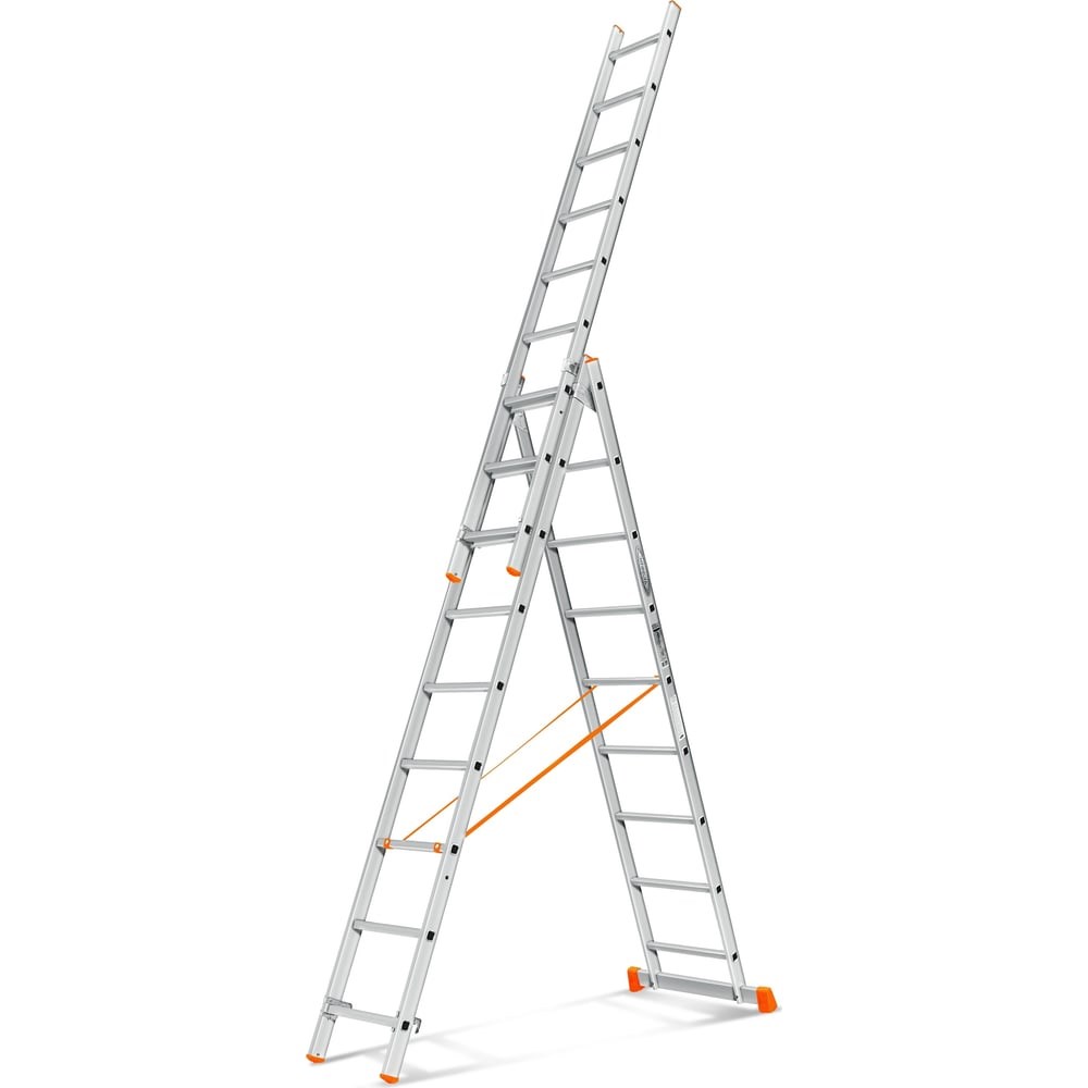 Трехсекционная лестница Эйфель Гранит 3х9 идеально подходит для высотных работ на загородных участках, в мастерских и складах. Модель отличается раздвижной конструкцией. Страховочные ремни выполнены из капрона, предохраняют от нежелательного расхождения лестницы. Ступень "ребро Эйфеля" имеет противоскользящие насечки на ребре. Данная лестница характеризуется износостойкостью и долгим сроком службы.