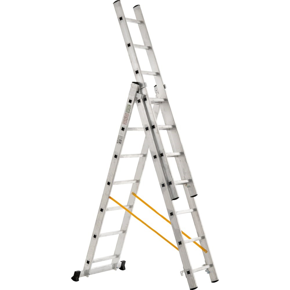 Трехсекционная лестница Inforce 3x7 ЛП-03-07 обладает способностью превращаться в различные модели конструкций. Используется на производствах. Прочность. Качественный профиль позволяет ей выдерживать нагрузку до 150 кг. Универсальность. Модель можно использовать в качестве стремянки, стремянки с выносной консолью, приставной лестницы с одной, двумя или тремя секциями. Отличная устойчивость. Широкая поперечная траверса и антискользящие пластиковые наконечники не дают лестнице смещаться.