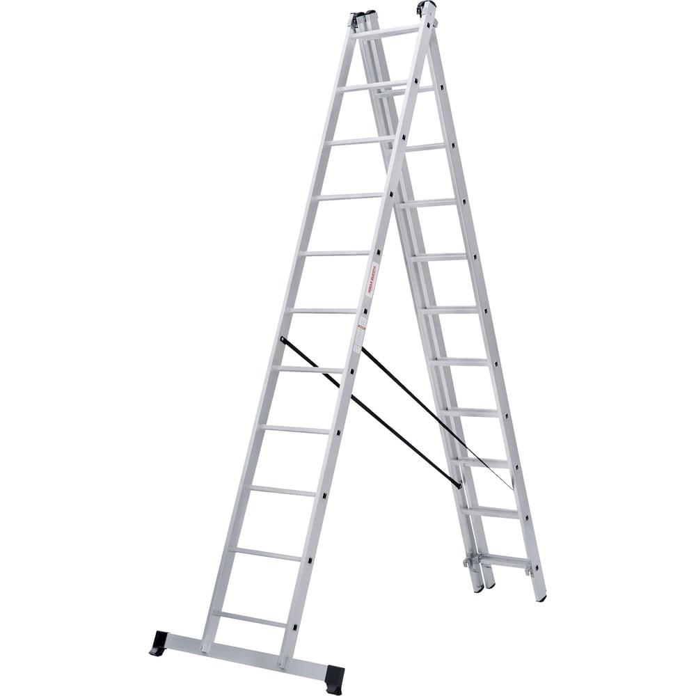 Трехсекционная лестница Новая Высота 3х11 ступеней 1230311 представляет собой три соединенные секции и в зависимости от их расположения используется как стремянка, стремянка с выдвинутой секцией, приставная односекционная, приставная выдвижная лестница. Оптимальна для использования на лестничных маршах. Для защиты от расхождения используются страховочные ремни. Благодаря многократной развальцовке в соединении ступеней со стойками изделие имеет долгий срок службы.