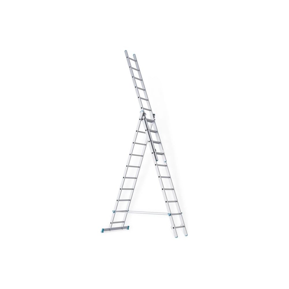 Внимание! Изображение товара отличается от реального, ориентируйтесь на технические характеристики. Лестница трехсекционная алюминиевая – раздвижная лестница, которая состоит из 3 секций (в каждой по 16 ступеней). Одна секция является съемной и может использоваться в качестве приставной лестницы или удлиняющей части. Изготовлена из металла высокого качества, отличается исключительной прочностью, удобством в применении и неприхотливостью к условиям эксплуатации. Надежная конструкция, устойчивая опора со стабилизаторами и растяжки между ножками обеспечивают безопасность при выполнении высотных работ. Алюминиевый профиль, из которого выполнена лестница, обладает устойчивостью к коррозии, не деформируется при интенсивных нагрузках и не реагирует на атмосферные воздействия. Это позволяет использовать данную модель как внутри, так и снаружи помещений. Высота в виде приставной лестницы, м - 11,8 Высота в виде стремянки, м - 8,15 Рабочая высота в виде стремянки , м - 9,15 Рабочая высота в виде лестницы , м - 12,8