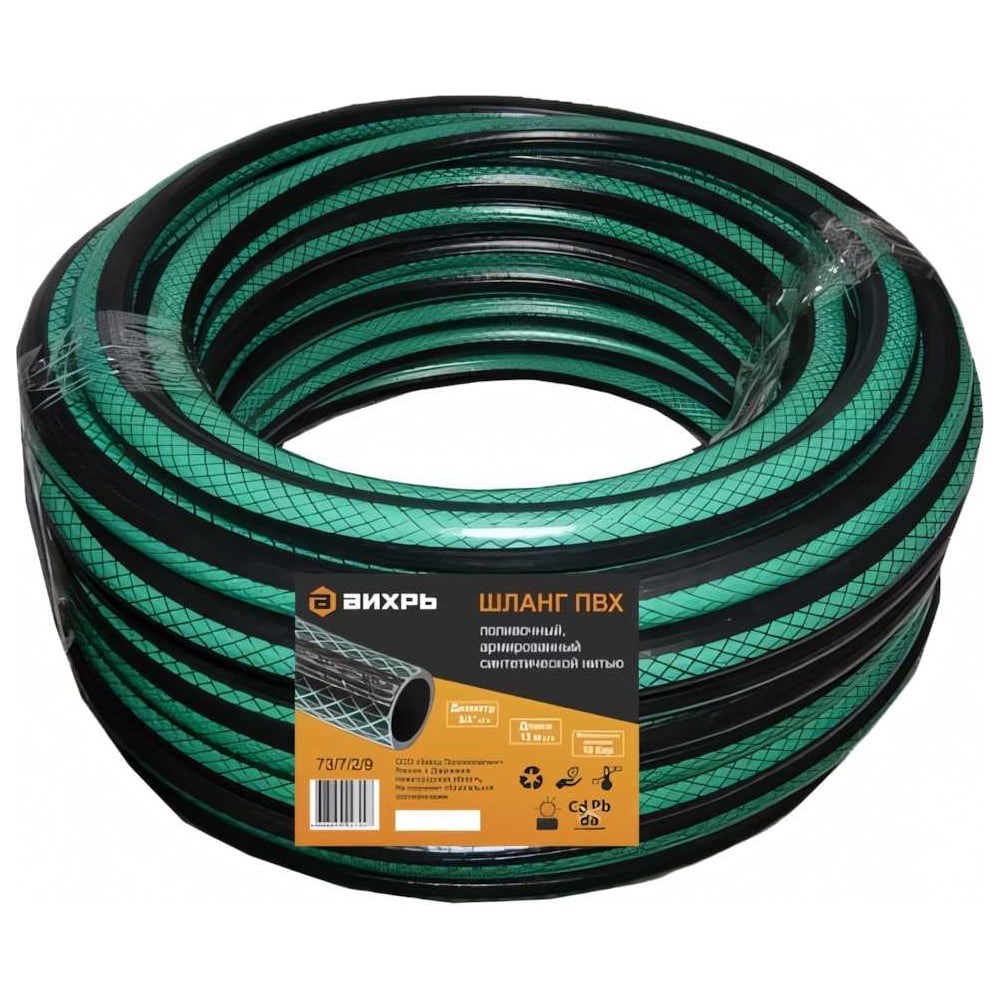 Армированный поливочный шланг Вихрь ПВХ, трёхслойный, 3/4", 15 м, зелёный 73/7/2/9 используется для орошения дачи или сада. Надежность. Выполнен из трёх слоев армированного синтетической нитью ПВХ, что обеспечивает износостойкость, гибкость и устойчивость шланга к воздействию солнца. Сохраняет свою гибкость и не перекручивается при использовании. Безопасность. Не содержит вредных примесей, безопасен для окружающей среды и человека.