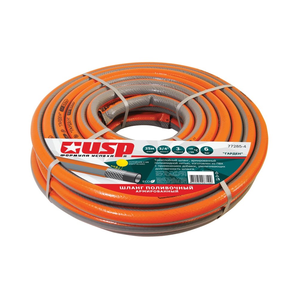 Трехслойный поливочный шланг Usp ГАРДЕН 3/4"х 25 м 77285-4 - незаменимый помощник для полива растений на садовых и огородных участках. Шланг изготовлен из ПВХ и имеет армированный слой, что обеспечивает прочность и устойчивость к разрывам. Изделие обладает широким диапазоном рабочих температур, благодаря чему подойдет для всепогодного применения.