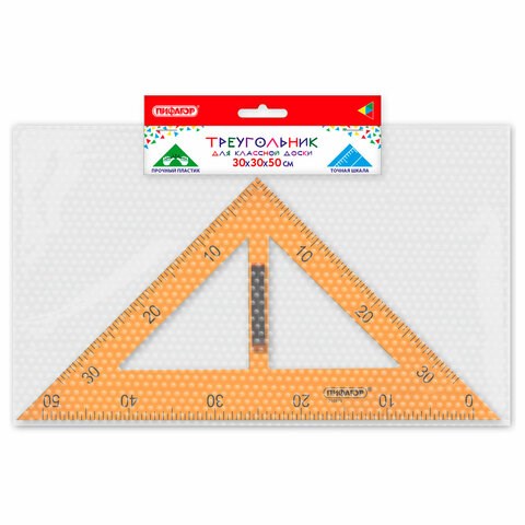 Изготовлен из прочного пластика. Длина шкалы - 50 см, углы - 45° и 90°. Обладает четкой контрастной печатной разметкой. Цвет треугольника - оранжевый. Упакован в воздушно-пузырчатую пленку.