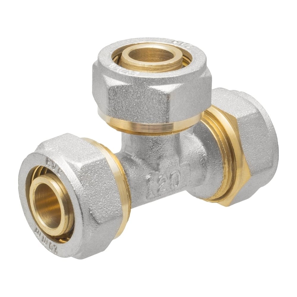 Тройник 20х20х20 ц/ц/ц Rvc RC 00700 предназначен для создания разъемного обжимного соединения трубопроводов из металлополимерных труб в системах питьевого и хозяйственного водопровода, горячего водоснабжения, отопления, а также на технологических трубопроводах, транспортирующих жидкости, не агрессивные к материалам труб и соединителей. Материал прокладки: синтетический каучук EPDM Материал прокладки диэлектрической: фторопласт PTFE Рабочая температура: от -20°C до +90°C Номинальное давление: 10 Bar