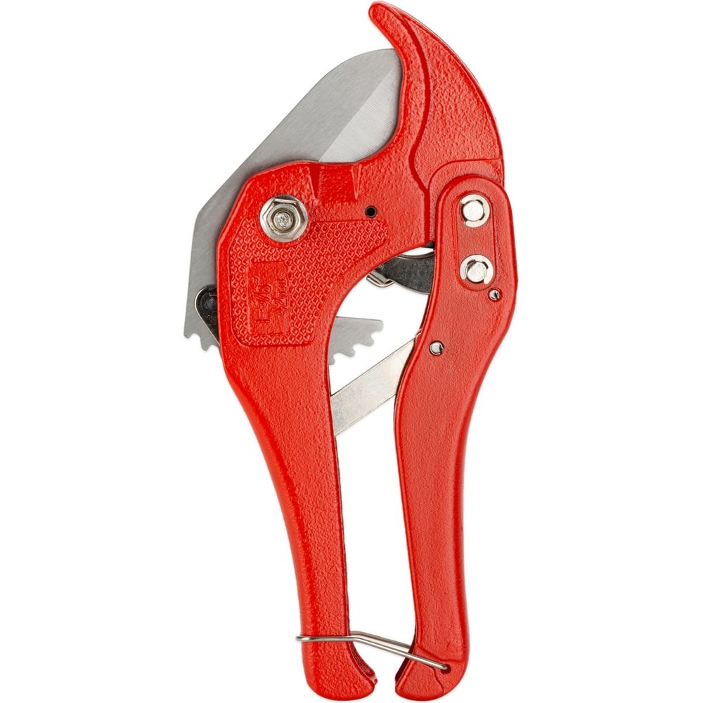 Ножницы для пластиковых и металлопластиковых труб до 42 мм VIRAНожницы предназначены для резки пластиковых и металлопластиковых труб. Инструмент оснащен храповым механизмом, который позволяет снизить усилие при резке. Благодаря ножницам, значительно снижается время работы и получается аккуратный, строго перпендикулярный рез необходимый для качественного и герметичного соединения труб. Корпус изготовлен из дюралюминиевого сплава, лезвие из нержавеющей стали 3CR13Характеристики:Материал лезвия: нержавеющая сталь 3CR13Материал ножниц: дюралюминийВес ножниц (г): 238Диаметр труб (мм): до 42Совместимость с трубами: PEX, PP, PE, PU, PEX-AL-PEX, VPE, CPVC, PVC, PVDFПрименение: для резки пластиковых и металлопластиковых трубОсобенность: храповый механизм