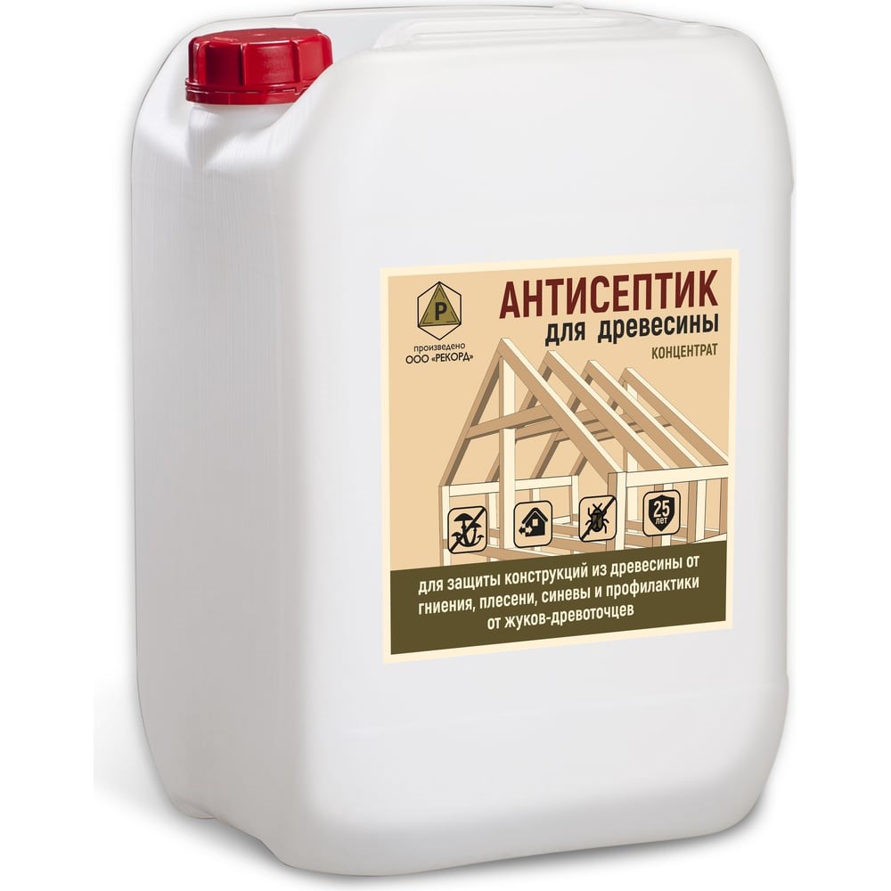 Антисептик для древесины концентрат 1:1 трудновымываемый красный РЕКОРД 10 л АС4 предназначен для максимальной защиты древесины различных пород дерева от гниения, плесени, синевы, профилактики от жуков-древоточцев внутри помещений и на открытом воздухе. Без использования антисептика для дерева конструкция будет разрушаться. Появление гнили на поверхности лишит материал внешней привлекательности и долговечности. Использование концентрированного, трудновымываемого антисептика для дерева, помогает надежно защитить древесину на срок от 25 до 35 лет. Антисептик может применяться как самостоятельное покрытие, так и биозащита под другие виды ЛКМ. Рекомендован для защиты беседок, террас, черновых полов, каркасов стен, балок и перекладин, стропил и других деревянных изделий, конструкций.