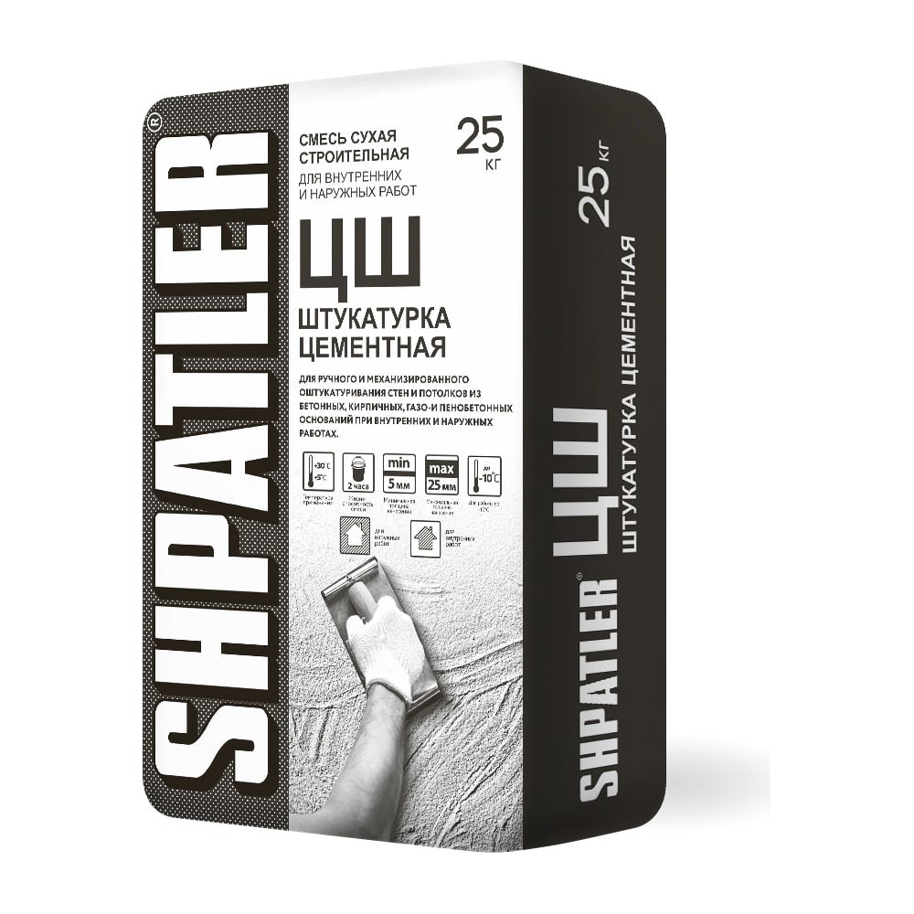 Цементная штукатурка ШПАТЛЕР 25 кг Ш00011 - сухая смесь предназначена для ручного и механизированного оштукатуривания стен и потолков из бетонных, кирпичных, газо- и пенобетонных оснований при внутренних и наружных работах. Допускается проведение работ при температуре до -10°С (упаковка с маркировкой «снежинка»). Описание продукта: Сухая смесь на основе цемента, состоящая из мелкозернистого заполнителя и модифицированная минеральными добавками. При смешивании с водой образует растворную смесь, удобную для нанесения и последующего заглаживания. После затвердевания образует морозостойкий и водостойкий раствор. Рекомендуется как для машинного, так и для ручного нанесения. ТЕХНИЧЕСКИЕ ХАРАКТЕРИСТИКИ* Температура применения +(5-30)°С Расход сухой смеси на 10 мм слоя 13-15 кг/м2 Расход воды при ручном нанесении 0,16-0,2 л/кг Наибольшая крупность зёрен заполнителя 0,63 мм Подвижность растворной смеси Пк3 Минимальная толщина слоя: -по бетону, железобетону 3 мм -по кирпичу 5 мм Максимальная толщина слоя: -по бетону, железобетону 15 мм -по кирпичу 25 мм Время использования готовой растворной смеси не менее 2 ч Марочная прочность М25 Марка по морозостойкости F35 Удельная эффективная активность естественных радионуклидов Аэфф не более 370 Бк/кг