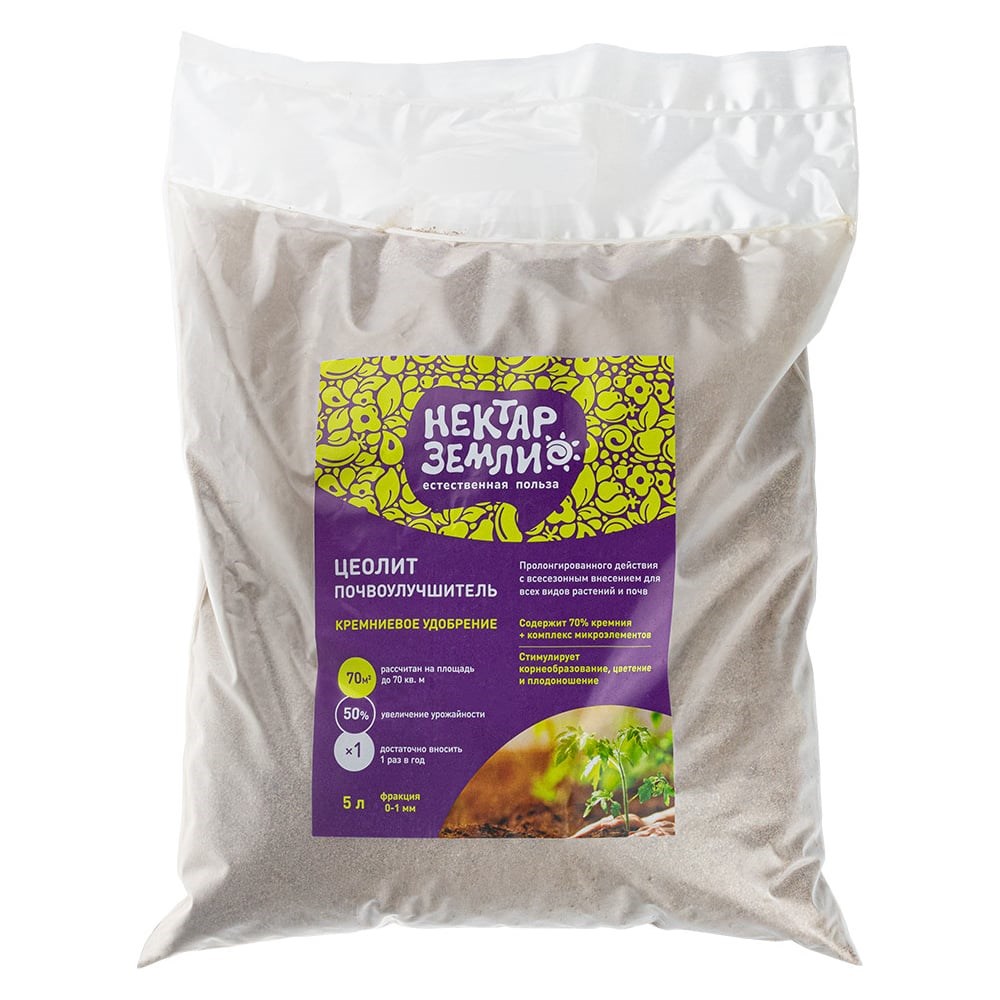 Цеолит для растений вулканический обожженный, 5 л — это природный минерал с уникальной микропористой структурой, который содержит оксиды кремния (SiO2) 70%, алюминия (Al2O3), а также кальций, магний, калий, натрий и другие макро- и микроэлементы в лёгкодоступной форме для растений. Цеолит фракции 0–1 мм подходит для всех видов растений — комнатных, садовых и огородных, а также используется при перекопке почвы весной и осенью.Влагорегуляция: поглощает избыточную влагу и постепенно отдаёт её растениям, предотвращая перелив и засухуАэрация почвы: разрыхляет грунт, улучшает доступ кислорода к корням, препятствует образованию земляной коркиАдсорбция токсинов: связывает тяжёлые металлы, избыточные соли и вредные соединения, снижая засолённость почвыСорбция питательных веществ: удерживает калий, магний, кальций и другие элементы, постепенно высвобождая их для растений, повышая эффективность удобренийЗащита от болезней: снижает риск грибковых инфекций и может выступать как натуральный инсектицид против почвенных вредителейТакже может называться: цеолит, цеолит для растений, цеолит для комнатных растений, цеолит для цветов, цеолит для сада, цеолит для растений 5 л, цеолит вулканический, цеолит для рассады, удобрение, почвоулучшитель, улучшитель почвы, кремний.