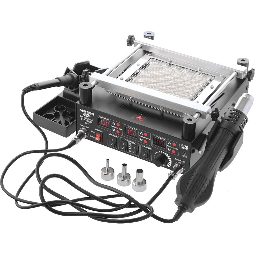 МЕГЕОН 00363 – новинка в модельном ряду многофункциональных паяльных станций. Прибор создан для лужения и распайки большого количества электрокомпонентов. Станция состоит из термофена с центробежным нагнетателем воздуха, паяльника и стола предварительного нагрева. Предварительный нагрев является неотъемлемой операцией при проведении пайки и установки SMD- компонентов на печатные платы, чтобы избежать термоудара и перегрева. Изделие наделено микропроцессорным управлением, цифровой индикацией и стабилизацией температуры. Фен имеет функцию автоматического интеллектуального охлаждения. Маленький вес и мягкий провод упрощают работу с паяльником. Большое количество сменных наконечников разной формы типоразмера 900М-Т значительно упростят процесс пайки (приобретаются отдельно). Быстрый разогрев и стабильная температура делают работу с бессвинцовыми припоями предельно простой и безопасной.