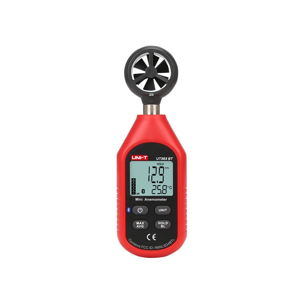 Цифровой анемометр-термометр с крыльчаткой UNI-T UT363BT 00-00011273 — это мини-измеритель скорости ветра и температуры. Может измерять скорость ветра до 30 м/с. Прибор способен передавать данные измерений через Bluetooth в пользовательское мобильное приложение UNI-T (iENV) для дальнейшего анализа, хранения и экспорта. iENV можно загрузить из Google Play, Apple Store или с веб-сайта UNI-T. Функции: MAX/AVG сохранение данных подсветка ЖК-дисплея автоматическое отключение питания индикация перегрузки индикация низкого заряда батареи