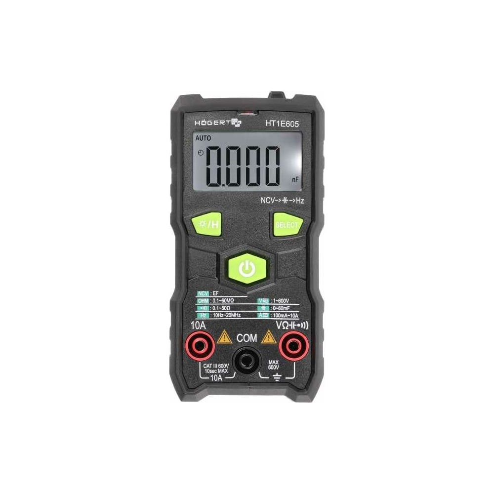 Цифровой мультиметр HOEGERT TECHNIK SMART HT1E605 - Простота, точность и безопасность в одном устройстве! Цифровой мультиметр SMART – это универсальный инструмент для диагностики и обнаружения неисправностей. Благодаря технологии FULL-SMART он идеально подходит как для опытных специалистов, так и для начинающих пользователей. Преимущества: Технология FULL-SMART: Автоматическое распознавание измеряемого параметра и настройка диапазона измерения (AUTO RANGE) для напряжения постоянного и переменного тока, диодного теста или сопротивления. Функция SELECT: Переключение между режимами бесконтактного измерения NCV, емкости, частоты и напряжения тока. TRUE RMS: Точное измерение среднеквадратического значения переменного тока и напряжения, даже для деформированных форм волны. NCV (бесконтактное обнаружение напряжения): Безопасное обнаружение тока в проводах без прямого контакта. Широкий диапазон измерений: Напряжение постоянного и переменного тока: до 600 В Постоянный и переменный ток: до 10 А Сопротивление: до 60 MΩ Емкость: до 60 mF Частота: до 20 mHz Тест диода и аккумулятора: 1,5 / 9 В Большой ЖК-экран с подсветкой: Отображение результатов измерений до 6000, четко видимых даже в условиях низкой освещенности. Экономичное энергопотребление: Питание от аккумулятора ААА 2x1,5 В, с функцией автоматического выключения для увеличения срока службы аккумулятора. Цифровой мультиметр HOEGERT TECHNIK SMART HT1E605 - это надежный и удобный инструмент для решения широкого спектра задач.