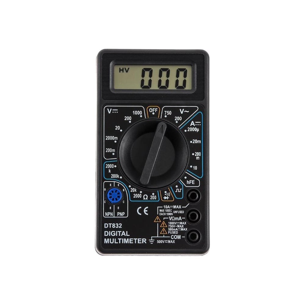 Цифровой мультиметр WHDZ DT832 – это один из серии карманных 3,5 -разрядных цифровых мультиметров для измерения постоянного, переменного напряжения, постоянного тока, сопротивлений, проверки диодов и транзисторов. Подойдет для использования в лабораториях, цехах, для хобби и для работы дома. Прибор оснащен защитой от перегрузки на всех пределах измерений и индикацией разряда батареи. Полученные данные выводятся на дисплей с крупными цифрами.