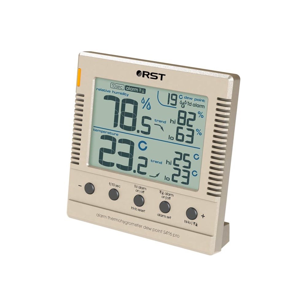 Цифровой термогигрометр RST, шампань, квадратный корпус RST02416 представляет собой профессиональный термогигрометр с высокочувствительным швейцарским термосенсором. Показания прибора включены в Госреестр. Измеряет и постоянно мониторит минимальные и максимальные значения температуры и влажности окружающего воздуха с указанием даты и времени сохранённых данных. Предусмотрена система расчёта температуры точки росы (образования конденсата) и шарика смоченного термометра, звуковая и световая сигнализации. Дополнительные характеристики диапазон измерения температуры воздуха (без датчика): -10 до +50 рабочий диапазон прибора 20...90 %rH погрешность измерений ± 2% для rH
