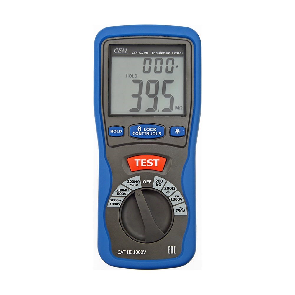 Цифровой тестер изоляции СЕМ DT-5500 480472 оснащен LCD-дисплеем большого размера с подсветкой, что обеспечивает комфортное считывание показаний. Специализированный инструмент позволяет быстро и точно определять сопротивление изоляции, напряжение постоянного и переменного тока. Модель питается от 6 батареек 1.5 В (тип АА).