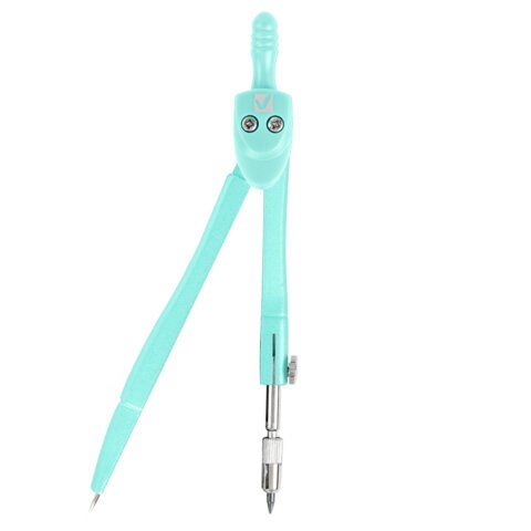 Инструмент длиной 120 мм имеет несгибаемые штанги и подстраиваемый грифель. Циркуль пастельно-бирюзового цвета, изготовлен из металла, с пластиковым защитным колпачком.