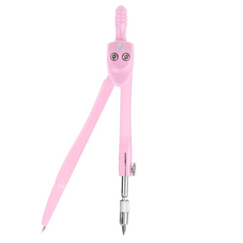 Инструмент длиной 120 мм имеет несгибаемые штанги и подстраиваемый грифель. Циркуль пастельно-розового цвета, изготовлен из металла, с пластиковым защитным колпачком.