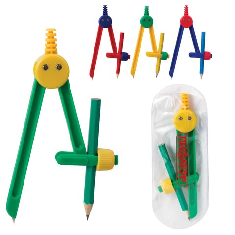 Инструмент длиной 110 мм имеет несгибаемые штанги и карандаш в комплекте. Изготовлен из пластика. Имеет удобную конструкцию и привлекательный дизайн. Минимальный диаметр вычерчиваемой окружности - 0,5 см. Цвет - ассорти. Поставляется в ПВХ-чехле.