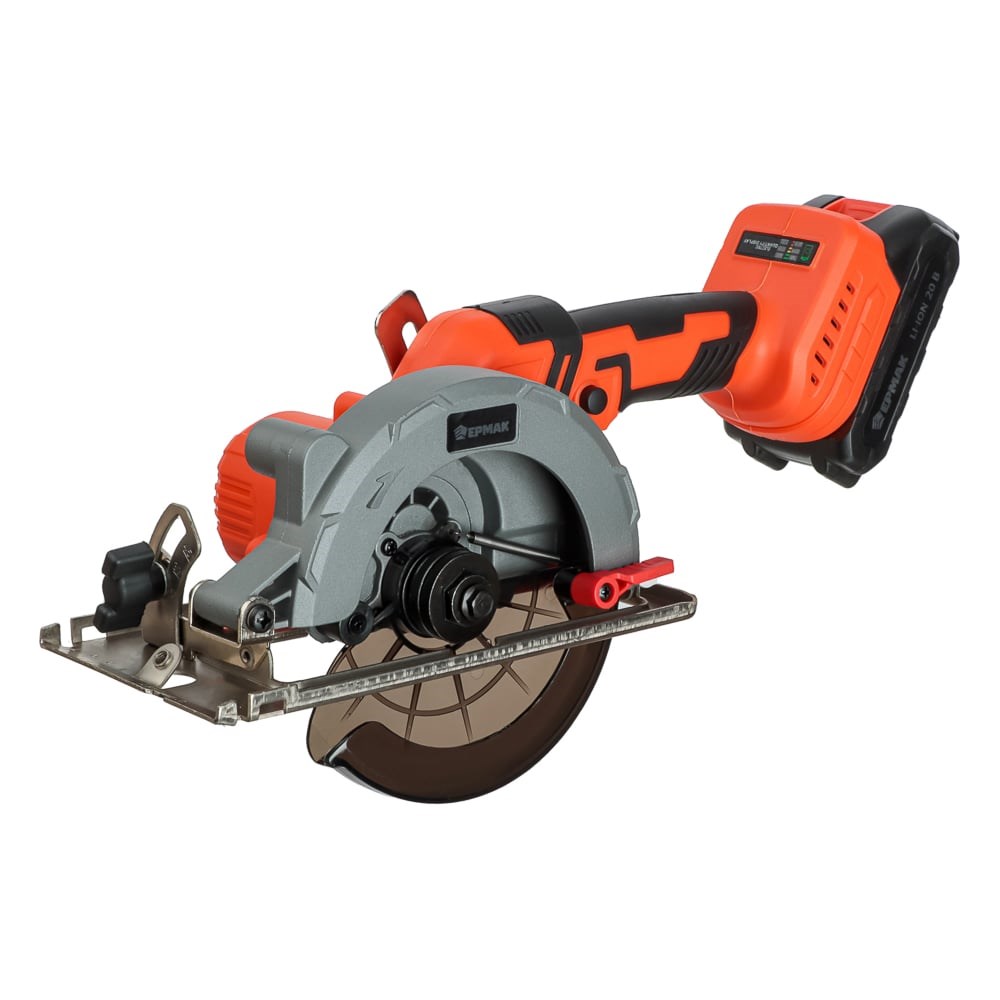 Пила циркулярная аккумуляторная бесщеточная ЕРМАК, мини, 20 В с аккумулятором емкостью 2А*ч незаменима в строительстве, в мастерской, а также на приусадебном участке. Характеризуется высокой скоростью работы в сочетании с точностью. Число оборотов – 6900 об/мин. Предусмотрена возможность регулировки угла скоса в диапазоне от 0 до 45 градусов. Подходящий диаметр диска – 125/140 мм. Посадочный диаметр – 20 мм. Максимальная глубина пропила – 50 мм. Инструмент полностью автономный, легкий, имеет эргономичную форму, что обеспечивает комфорт во время работы. Съемный аккумулятор совместим со всеми моделями инструмента ЕРМАК, входящими в систему ONE. Зарядное устройство поставляется в комплекте.