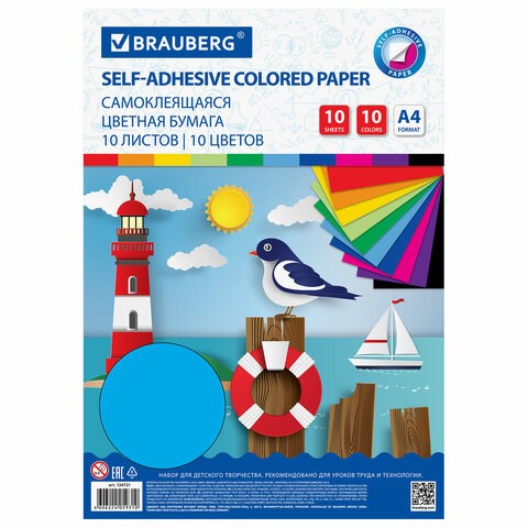 Цветная бумага А4 мелованная САМОКЛЕЯЩАЯСЯ, 10 листов 10 цветов, 80 г/м2, BRAUBERG, 124721