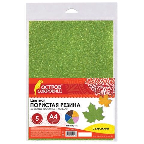 В набор входит 5 блестящих цветов, которые позволят создать уникальную и эффектную поделку! Листы формата А4 (21х29,7 см) толщиной 2 мм удобны для создания украшений из фоамирана, создания аппликаций, декорирования различных предметов и изделий. Глиттерный фоамиран-это фоамиран, декорированный блестками. Материал легко режется обычными ножницами, ему можно придать любую форму растягивая и скручивая, блёстки не осыпаются. Используется для создания флористического декора, аппликаций, сувениров, детского рукоделия и создания украшений. Готовые изделия представляют собой: аксессуары для волос (банты, ободки, резинки, короны), бижутерию, банты для подарочных упаковок, елочные игрушки. Не токсична, безопасна для детского творчества. Цветная пористая резина с глиттером ОСТРОВ СОКРОВИЩ - блестящий материал для воплощения Ваших творческих идей!