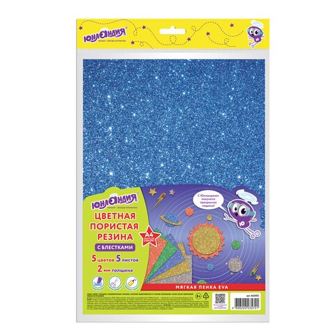 Пористая резина/фоамиран А4, 2 мм, НАБОР, 5 листов, 5 цветов, яркие цвета, блестки, ЮНЛАНДИЯ, 662052