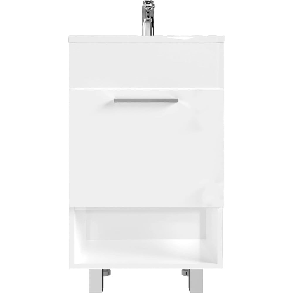 Тумба с раковиной в ванную 1Marka July 50 см напольная цвет Белый глянец У85932 представляет собой компактное и стильное решение для вашей ванной комнаты. Тумба выполнена в современном минималистичном стиле с правильными геометрическими формами и рациональностью. Компактная ручка на фасаде позволяет создать легкий и гармоничный образ, не утяжеленный фурнитурой. Тумба оснащена демпферами и дверными петлями с доводчиками для бесшумной и мягкой работы. В комплекте идет раковина из полимерной керамики. Выбирая тумбу для ванной комнаты July 50Н 1д с раковиной, вы получаете стильное и функциональное решение для вашей ванной комнаты, которое обеспечит комфорт и удобство использования