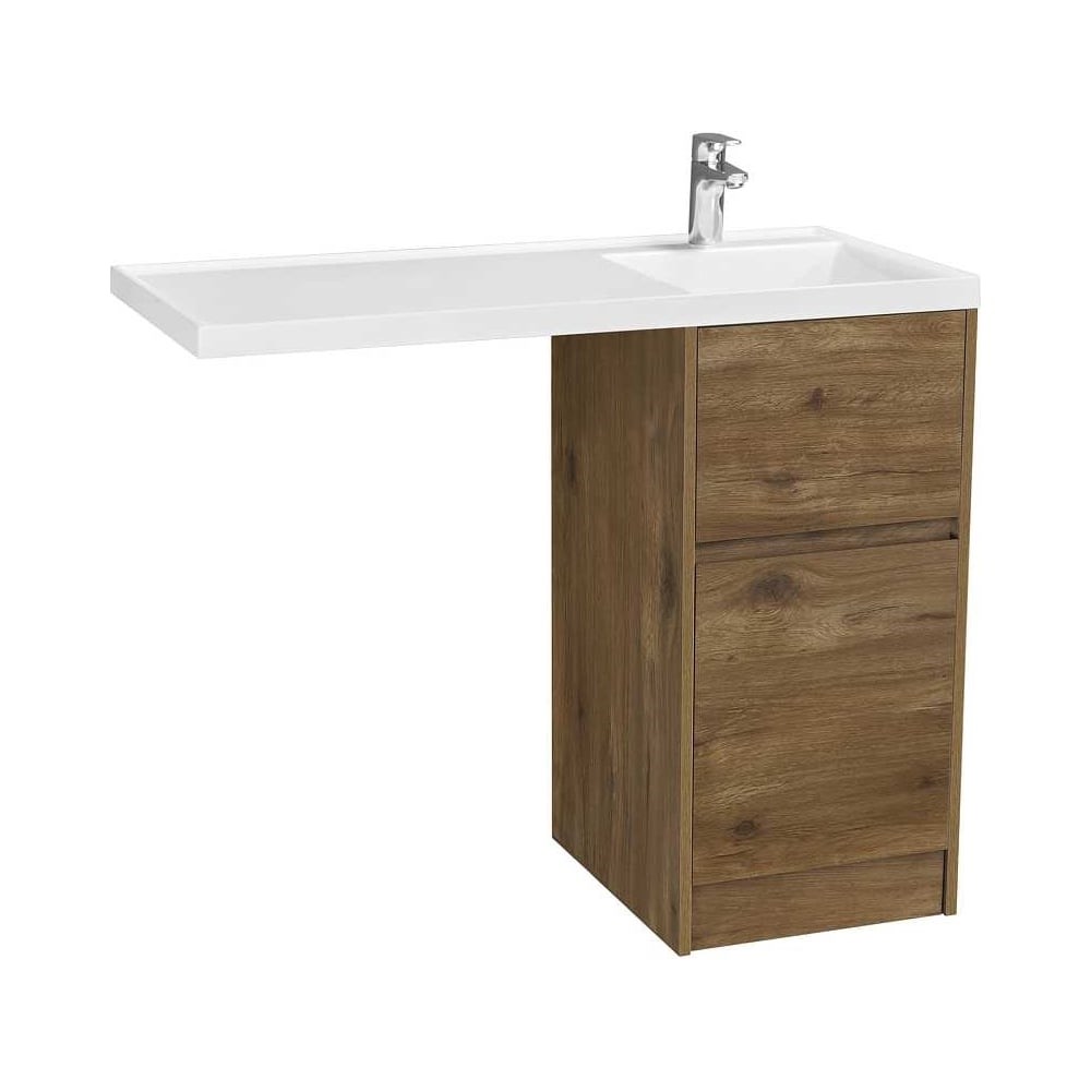 Тумба Лондри под стиральную машину выполнена из влагостойкой ламинированной плиты в древесной отделке. Тумбы комплектуются фасадами как с такой же древесной текстурой, так и в универсальном белом глянцевом цвете – это позволяет выбрать модель тумбы в соответствии с личными предпочтениями, создав наиболее удачное решение для конкретного интерьера ванной комнаты. Более того, при желании в одной тумбе можно совместить корпус и фасады в двух разных по оттенку древесных декорах. Верхний ящик открывается с помощью системы push-to-open, а нижний - за фасад с помощью удобного выпила под углом. Тумба установлена на регулируемые опоры, которые находятся за цоколем. Тумба комплектуется раковиной Лондри 105 из прочного литого мрамора (Приобретается отдельно!). Широкое крыло раковины обеспечивает ванную комнату дополнительным функциональным пространством. Внимание! Фасады к тумбе приобретаются отдельно.