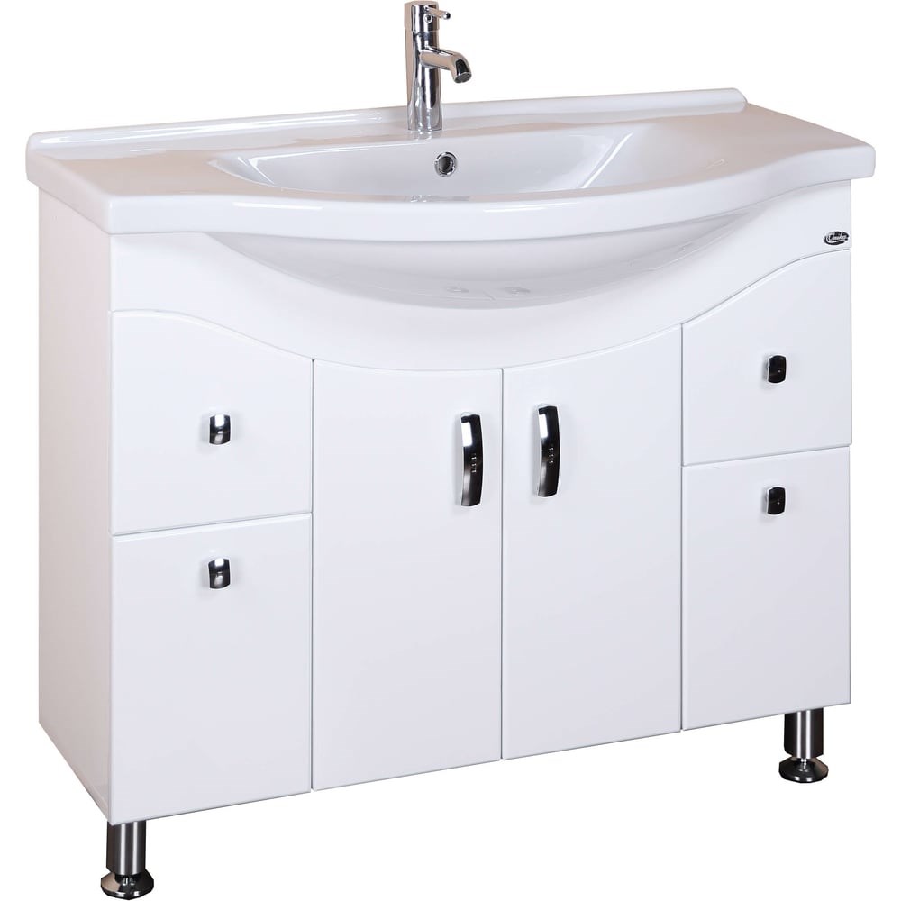 В тумбе Onika Эльбрус 100 белоснежный глянец фасада подчеркивается оригинальной хромированной фурнитурой и сложной изысканной геометрией линий. Современный функционал и огромное внутреннее пространство тумбы позволяет удобно расположить все необходимое: по центру тумбы 2 распашных двери скрывают большое отделение для крупных предметов, а по бокам 2 ниши за распашными дверцами и 2 выдвижных ящика созданы для хранения небольших вещей. Ящики тумбы оснащены направляющими полного выдвижения, а дверцы снабжены системой плавного закрывания. Корпус тумбы выполнен из ЛДСП, фасад - из ЛМДФ в пленке, устойчивых к механическим воздействиям, перепадам температур и высокой влажности. Шесть хромированных ручек и пять ножек (2 декоративных хромированных и 3 пластиковых) идут в комплекте с тумбой. Размеры тумбы без учета раковины и ножек: 96x33x68 cм. Размеры тумбы с учетом раковины и ножек: 100,5х52х83 см. Совместимая раковина - Santek Эльбрус 100.