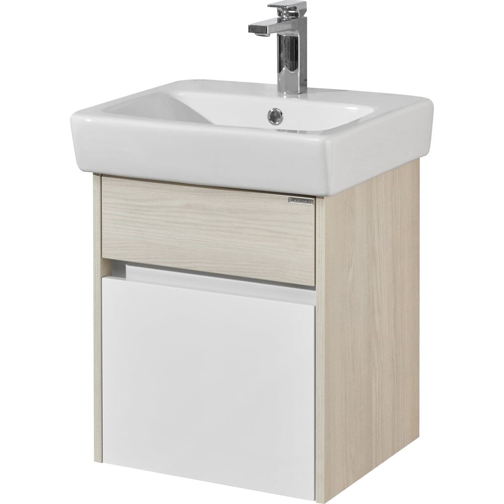 Тумба под раковину Акватон Верди PRO 50 белый, ясень фабрик 1A195901VDAV0 - функциональное и практичное решение для ванных комнат и санузлов со скромными габаритами. Компактная модель с комбинированной отделкой не занимает много места и позволяет разместить всё необходимое. Минималистичный дизайн подчеркивает отсутствие лицевой фурнитуры. Верхний фасад и корпус тумбы изготовлены из ламинированной, текстурированной влагостойкой ЛДСП в цвете ясень фабрик. Нижний фасад выполнен из МДФ и окрашен в белый цвет высокой степени глянца. Конструкция верхнего ящика подвесных тумб разделена на две секции, что очень удобно для хранения мелких предметов. Глубокий и вместительный нижний ящик предназначен для более габаритных предметов.