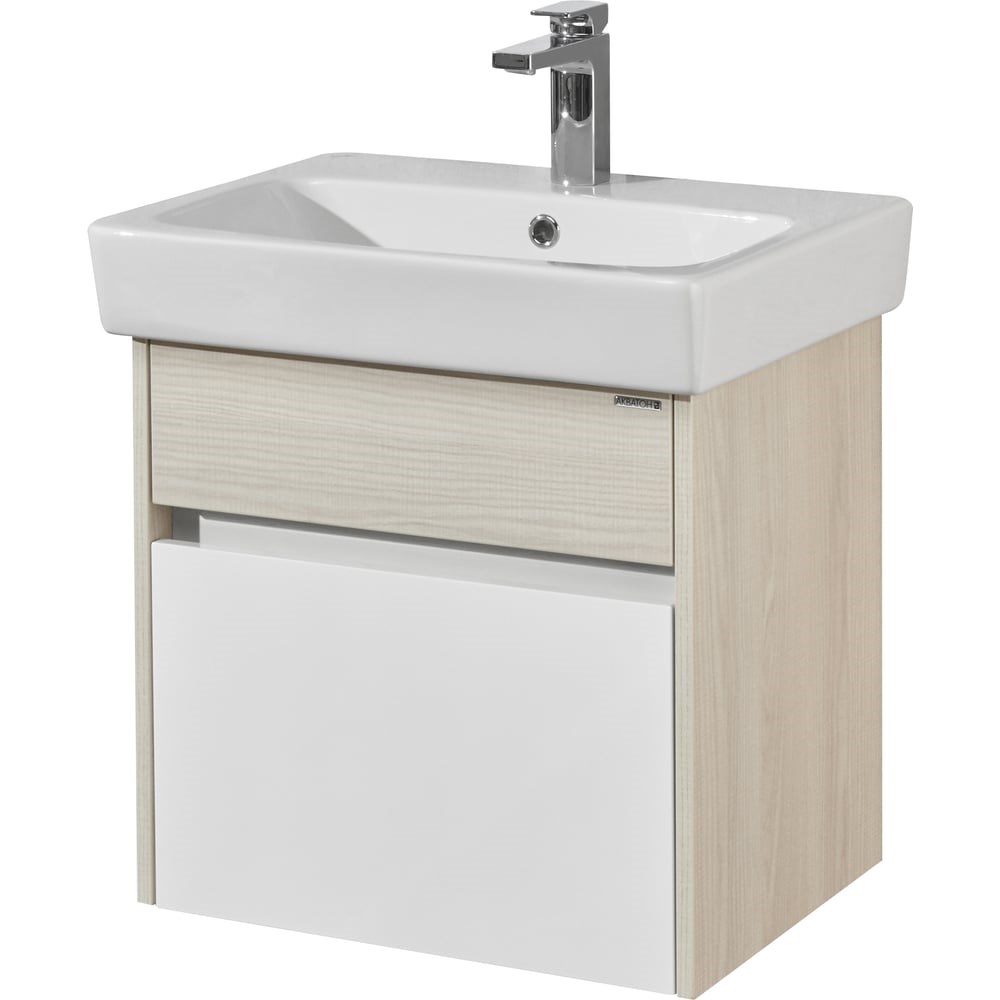 Тумба AQUATON ВЕРДИ 60 белый/ясень фабрик, под раковину Нео 60 1A206701VDAV0 00045171 разработана для тех, кто ценит удобство, комфорт и лаконичный изящный дизайн. Модель с комбинированной отделкой без лицевой фурнитуры - стильное и современное решение в духе минимализма. Верхний фасад и корпус тумбы изготовлены из ламинированной, текстурированной влагостойкой ЛДСП в цвете ясень фабрик. Нижний фасад выполнен из МДФ и окрашен в белый цвет с высокой степенью глянца. Плавное выдвижение обеспечивают надежные направляющие с доводчиком.