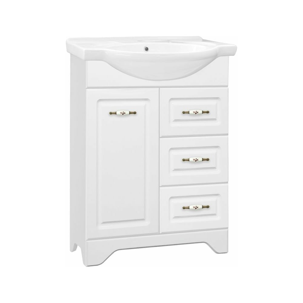 Тумба Style Line Олеандр-2 65 (3 ящ.) под умывальник Байкал 65, Люкс белая ЛС-00000047 классического дизайна, декорированная ручками с керамическими вставками под бронзу с изящным рисунком. Направляющие полного выдвижения Hettich. Сборка изделия с помощью эксцентриковых стяжек Hafele. Все материалы полностью влагостойкие. Данная тумба предусматривает открытую подводку воды.