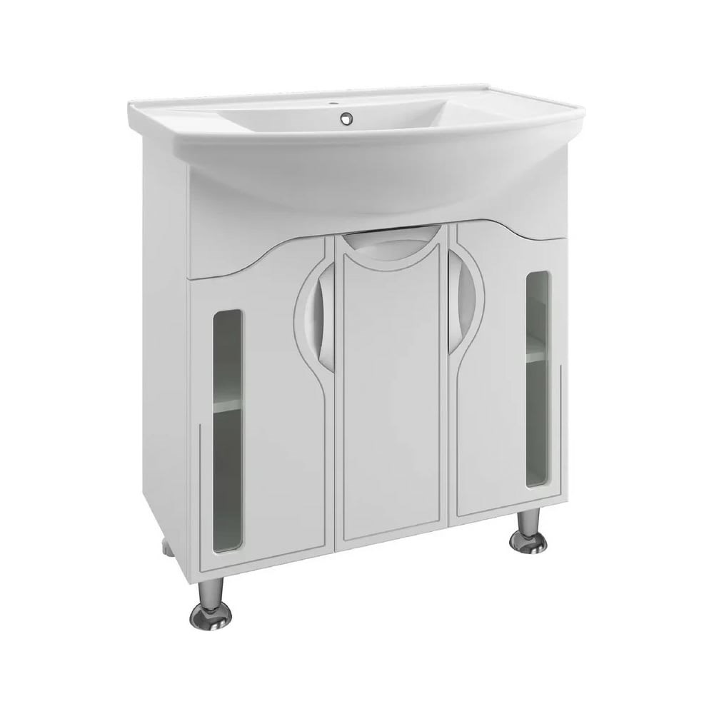Внимание! Раковина приобретается отдельно. Арт. - RUNO Умывальник мебельный Kirovit Стиль 75 УТ000001575 Тумба RUNO ТОЛЕДО 75 под умывальник Стиль 75 00000001039 - изысканный и элегантный дизайн в оформлении ванной комнаты. Тумба под раковину ТОЛЕДО (напольная), выполненная в белом цвете с оригинальной фрезеровкой и стеклянными вставками на фасадах превосходно украсит любой интерьер ванной комнаты, имеет три распашных дверцы и одну встроенную полку. В комплекте к тумбе идут 3 врезные ручки, петли со встроенным доводчиком, 2 хромированные и 2 пластиковые ножки. Мебель для ванной RUNO - красота и практичность в мелочах!