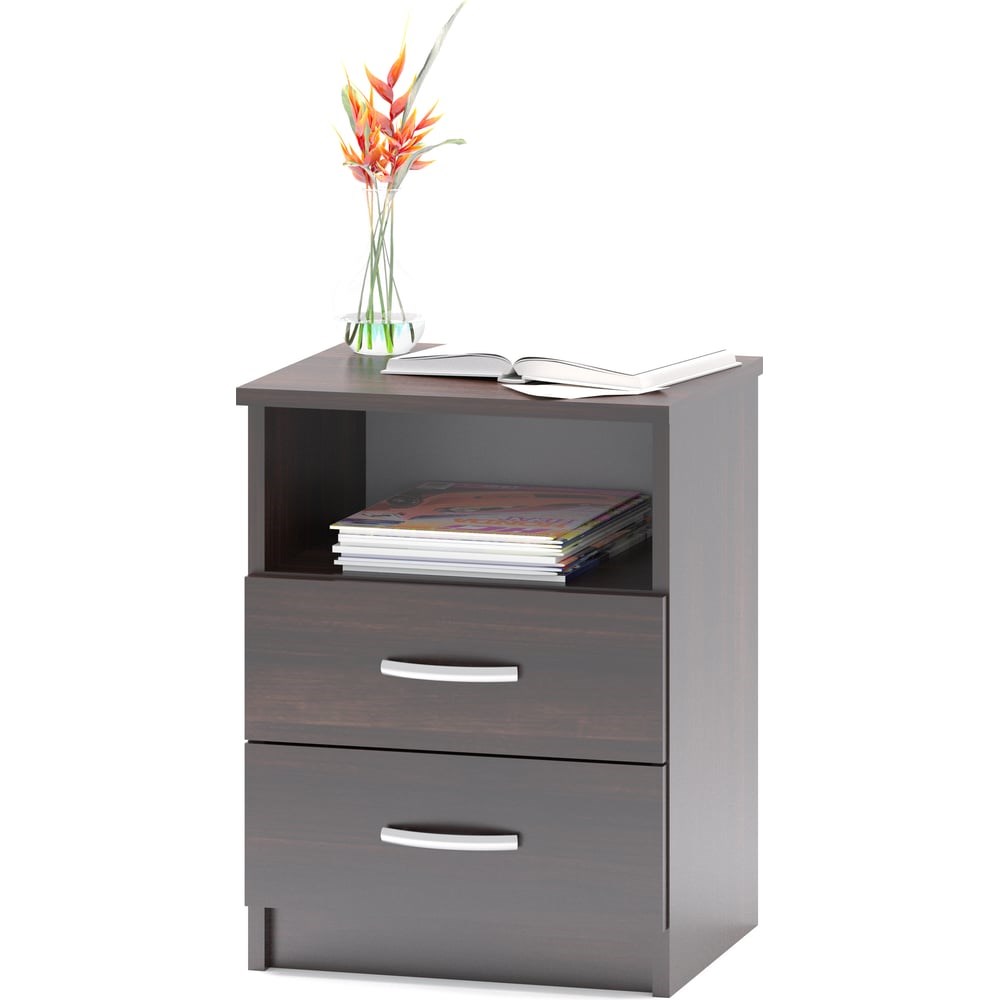 Тумба СОКОЛ венге КТ-09.1 КТ09.1В5 имеет открытую нишу и два выдвижных ящика. Практичный элемент для хранения канцелярских принадлежностей и документов в офисе или дома. Также тумбочку можно использовать как прикроватную: на ней поместится небольшой ночник, а в ящиках и на полке будет удобно держать под рукой разные мелочи. Внутренние размеры ящика — 310 х 268 мм. Изделие выполняется из ЛДСП толщиной 16, края обработаны кромкой ПВХ 0,4 мм. В ящиках используются роликовые направляющие. Обратите внимание! Задняя стенка сделана из ДВП серого цвета.