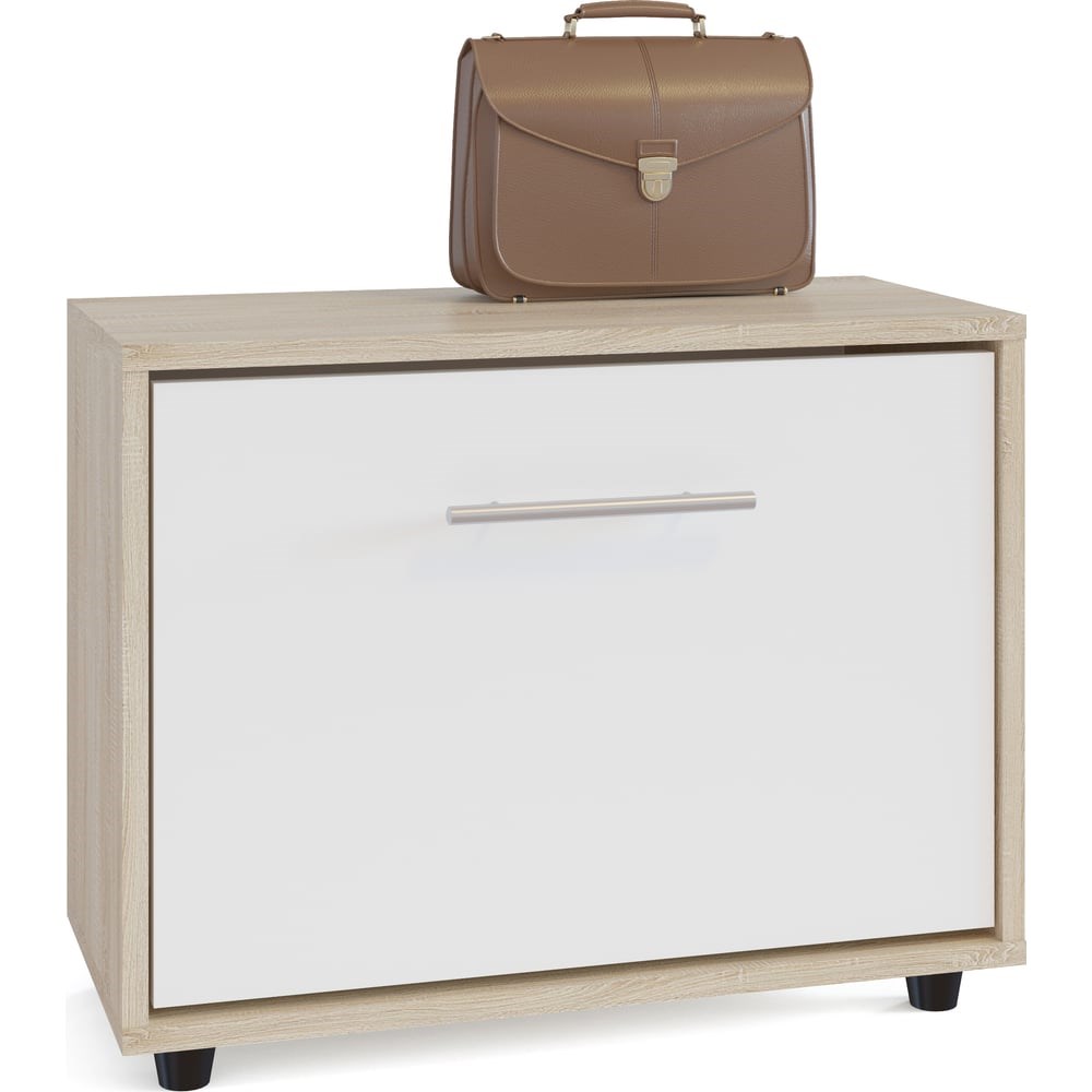 Тумба СОКОЛ дуб сонома/белый ТП-1 ШОТП1Сб шириной 600 мм. Дверь оснащена откидывающимся механизмом со специальными полками для размещения обуви, который обеспечивает удобство хранения и легкий доступ к необходимой паре кроссовок или туфель. Тумбу в закрытом состоянии можно использовать в качестве места для сидения.