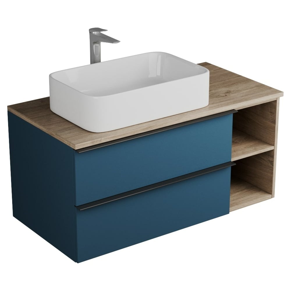 Тумба Sangro 100см (510012); корпус ВЛДСП-покрытие ПВХ; фасад МДФ 19мм-покрытие ПВХ; цвет индиго бархат; столешница МДФ 19мм-покртиые ПВХ; цвет дуб харбо; верхний ящик с системой разделения; 2 выдвижных ящика со встроенным доводчиком плавного закрывания, скрытого монтажа; две ниши; внутренняя отделка цвет дуб харбо; раковина в комплект не входит; отдельно можно приобрести накладную раковину