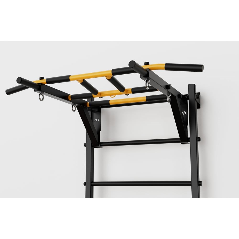Турник рукоход на шведскую стенку BARFITS New Age, черный л00364 – лучший выбор для маленьких детей. Ребенку удобно и безопасно будет подтягиваться на ширине плеч, как раз в этом месте есть рукоятки для хвата. Вы с легкостью сможете установить комфортную и безопасную высоту под рост вашего ребенка, исключая риск падения с высокой высоты. Универсальный турник имеет 6 видов хвата (классический средний на ширине плеч, узкий параллельный, широкий хват, широкий параллельный + 2 дополнительные перекладины рукохода). Обратите внимание, что специальные рукоятки есть на всех хватах. На нем можно комплексно тренировать мышцы спины и рук. Надежная стальная конструкция выдерживает до 250 кг. Вылет перекладины от стены 57 см - это идеальный вылет, так как в некоторых упражнениях требуется смещать корпус тела вперед, и при таком вылете вы не будете касаться ногами шведской стенки. Турник имеет 5 колец подвесов для размещения детского навесного оборудования и других снарядов.