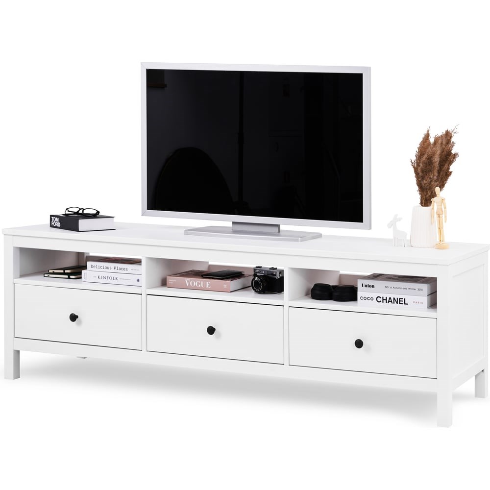 ТВ-Тумба КЫМОР в скандинавском стиле станет прекрасным дополнением к вашему интерьеру. Выполнена из массива сосны, который ценится за свою прочность, долговечность и экологичность. Покрытие выполнено с использованием красителей на водной основе и лака на основе акриловых смол с УФ-отверждением. Имеет три ящика на роликовых направляющих, которые изнутри не покрашены, как основная часть, что придает им естественный вид. Эта тумба идеально подходит для размещения телевизора и другой мультимедийной техники, обеспечивая удобное хранение и организованность пространства.