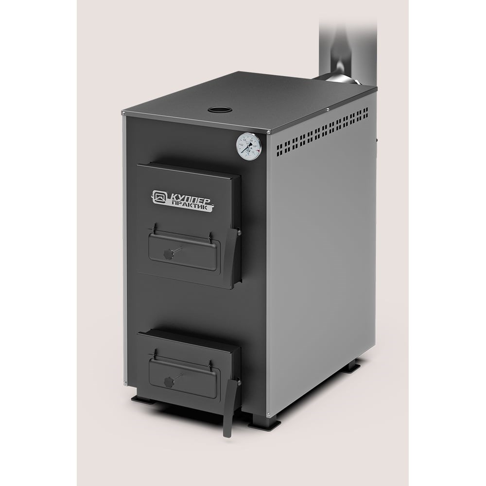 Твердотопливный котел Теплодар Куппер Практик - 20 (1.1) ОК.90.000.00 предназначен для отопления жилых домов и других помещений площадью от 130 до 200 м² при высоте потолка до 2,7 м. Длительность горения составляет целых 6 часов. Универсальность Котел универсален и может работать как в закрытых, так и в открытых системах отопления с принудительной циркуляцией теплоносителя. Кроме того, может использоваться как самостоятельный источник тепловой энергии в качестве дополнения к существующим системам отопления с газовыми, жидкотопливными или электрическими котлами. Все необходимое в комплекте В базовую комплектацию котла Куппер Практик входит: кочерга, шуровка, термометр, поворотный шибер. Небольшие габариты Котел занимает совсем немного места и может быть установлен непосредственно в жилом помещении.
