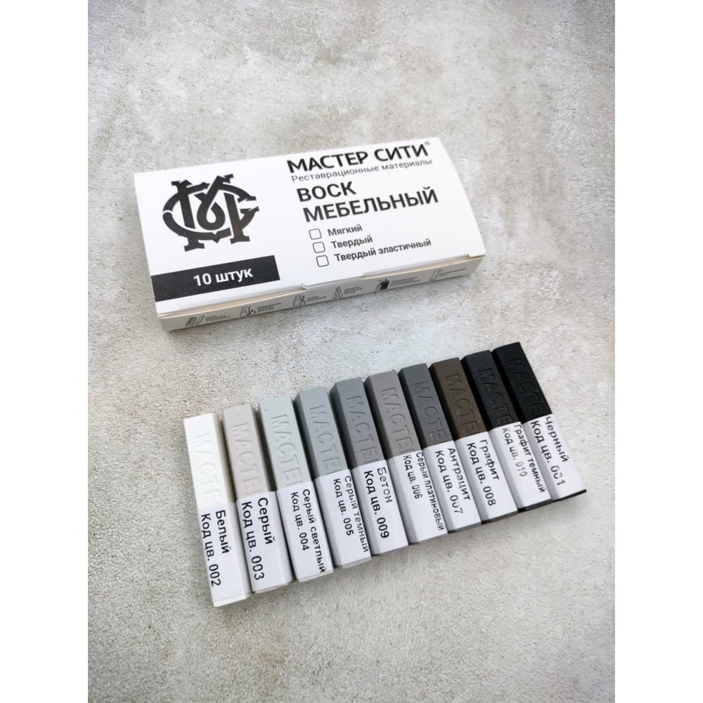 Воск мебельный твёрдый в наборе из 10ти цветов от ведущего российского производителя материалов для реставрации Мастер Сити. Применяйте для восстановления мебели - углов и ребер, столешниц, напольных покрытий, ламината. Твердый мебельный воск специально разработан для реставрации мебели и дефектов на изделиях с высокими требованиями по износостойкости. Набор идеально подойдет от повреждений на мебели после ее сборки и установки. Поможет в восстановлении углов, сколов на столешнице, глубоких сколов на напольных покрытиях. Твердый воск может использоваться для восстановления поврежденных поверхностей керамической плитки, он прочно закрепляется в повреждении, не дает усадки и не выцветает со временем. Твердый воск для мебели обладает высокой прочностью, устойчив к истиранию, влаге и мытью. Подходит для ремонта повреждений на мебели, окнах, дверях, лестницах, напольных покрытиях, керамической плитке и других изделиях из ЛДСП, МДФ, массива дерева, пластика. Воск Мастер Сити помогает восстановить мебель. С палитрой из 10ти цветов подобрать цвет к мебели будет удобнее. Также Воски отлично смешиваются между собой. Внимание! Твердый воск требует плавления при нанесении. Для этого используйте ВОСКОПЛАВИТЕЛЬ Мастер Сити. Также воск можно расплавить нагретым кончиком ножа. Подробную инструкцию читайте в карточке товара. Обратите внимание, что из-за индивидуальных настроек вашего экрана цвет продукта может отличаться. Проверьте ваш выбор цвета на экранах двух устройств.