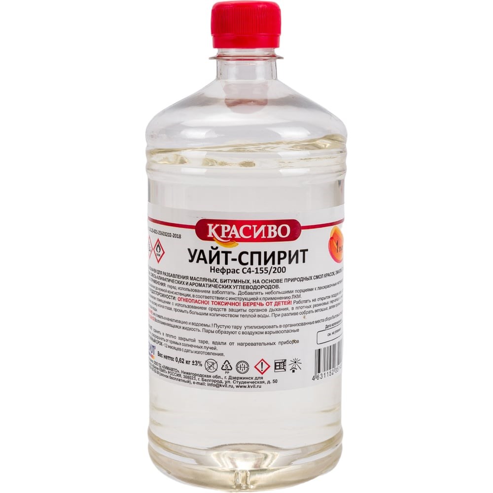 Уайт - спирит Красиво (1 л/0,62 кг) 4631152351496 предназначен для разбавления масляных, битумных, на основе природных смол, эмалей, лаков. СОСТАВ: смесь алифатических и ароматических углеводородов. СПОСОБ ПРИМЕНЕНИЯ: перед использованием взболтать. Добавлять небольшими порциями к лакокрасочным материалам при перемешивании до нужной консистенции, в соответствии с инструкцией к применению ЛКМ. Огнеопасно! Токсично! Вредно при контакте с кожей! МЕРЫ ПРЕДОСТОРОЖНОСТИ: работать на открытом воздухе или в хорошо проветриваемом помещении с использованием средств защиты органов дыхания, в плотных резиновых перчатках и очках. При попадании на кожу или в глаза, промыть большим количеством теплой воды. При разливе собрать ветошью, затем промыть большим количеством воды. ВНИМАНИЕ: не сливать в канализацию и водоемы. Тару с остатками продукта плотно закрыть и утилизировать в организованные места сбора бытовых отходов. ХРАНЕНИЕ: хранить в плотно закрытой таре, вдали от нагревательных приборов отопления, предохранять от прямых солнечных лучей.