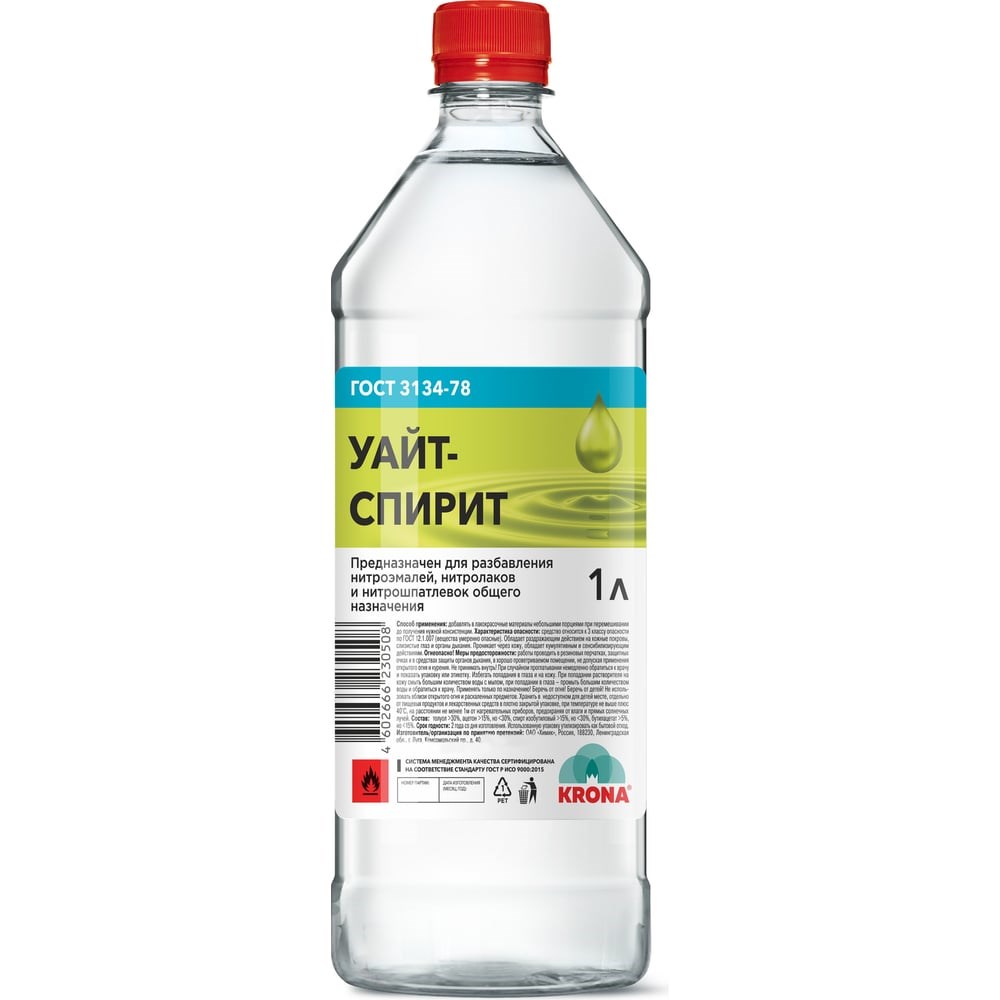 Уайт-спирит KRONA ГОСТ 1 л 66211200 предназначен для разбавления и растворения лаков, масляных красок, эмалей, грунтовок и других лакокрасочных материалов. Применяется для обезжиривания поверхностей перед окраской, может использоваться для очистки инструментов.