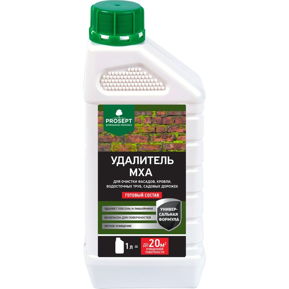 PROSEPT Удалитель мха готовый состав / 1 л 084-1 средство для удаления мха, лишайников и плесени с фасадов, кровли, водосточных труб, балконов, навесов, террас, садовых дорожек. Подходит для кирпичных, бетонных, асфальтовых, керамических, синтетических, полимерных (сайдинг), деревянных, окрашенных поверхностей, а также из нержавеющей стали, натурального и искусственного камня (гранит, терраццо). Способы применения: предварительно протестировать устойчивость материала на незаметном участке. Равномерно нанести средство на пораженную поверхность. Дать подействовать средству в течение 30-60 минут. При необходимости увеличить время действия до 1-2 суток. Остатки мха и лишайников удалить щеткой или скребком. Поверхность промыть водой. При проведении работ рекомендуется накрыть садовые посадки пленкой, чтобы избежать попадания средства. Работы рекомендуется проводить в сухую солнечную погоду при температуре окружающей среды и обрабатываемой поверхности не ниже +5°С и не выше +30°С. Расход: расход рабочего раствора 100-200г/м². Меры предосторожности: избегать попадания на кожу, глаза и слизистые. В случае попадания – обильно промыть водой. При необходимости обратиться к врачу. Для защиты рук использовать резиновые перчатки. Не смешивать с другими средствами! Не глотать! Беречь от детей! Допускается замораживание. После размораживая чистящие свойства сохраняются.