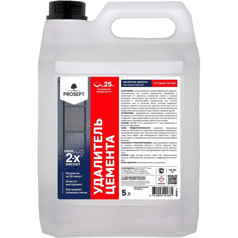 Удалитель цемента, готовый состав, 5 л PROSEPT ВИЦК-5 сильнокислотное концентрированное средство предназначено для очистки строительных материалов и инструмента от цементных загрязнений, копоти и солевых отложений.Состав используетсядля удаления остатков цементных растворов с любых поверхностейдля очистки кирпичных стен от бетонных брызг, остатков кладочного раствора, извести и высоловдля удаления плиточного клея и затирки для швовдля послестроительной уборки помещений, чистки оборудования для приготовления и транспортировки бетонадля мытья форм при изготовлении тротуарной плиткидля удаления серы и копоти с фасадов зданийСпособы применения:Нанести рабочий раствор на поверхность при помощи распылителя, кисти либо губкой. Дать подействовать 5-15 минут.Не давая высохнуть поверхности, протереть мокрой губкой и смыть водой.Расход: 100-300 г/м² в зависимости от типа поверхности и степени загрязнения.