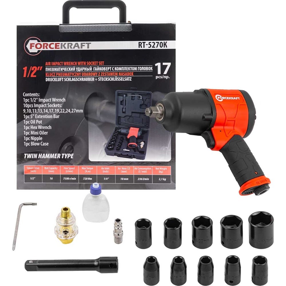 Пневмогайковерт от бренда Forcekraft является ударным инструментом, оснащенным механизмом "Twin Hammer" (двойной молоток) и предназначен для использования с головками 1/2 дюйма.Точная регулировка. Степень затяжки болтов контролируется регулятором.Ударопрочность. Корпус инструмента отличается повышенной прочностью и устойчивостью к механическим повреждениям.Надежность. Облегченный корпус инструмента позволяет применять его в условиях ограниченного рабочего пространства, а прорезиненная профильная рукоятка гарантирует комфорт при работе с инструментом. Регулируемого крутящего момента 720 Н*м достаточно, чтобы справляться с сильно закисшими соединениями при разборке, и обеспечить требуемый момент затяжки гаек при сборке механизмов.Широкая комплектация. В комплекте поставляются ключ Г-образный T25, евроштуцер, лубрикатор, удлинитель 125 мм, ударные головки (9-11,13,14, 17, 19, 22, 24, 27 мм), маслёнка для смазывания механизма.Такой пневмогайковерт является надежным и мощным инструментом, который подойдет для широкого спектра задач, связанных с автомобильным ремонтом, строительством и другими областями, где требуется сильное крутящее усилие.Удобство хранения. Для удобного хранения и перемещения в комплекте идет прочный пластиковый кейс.