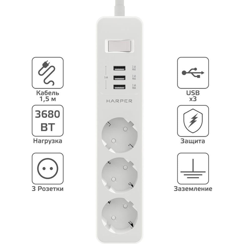 Удлинитель с USB зарядкой HARPER UCH-315 White H00002825 оснащен 3 розетками и 3 USB-портами. Все розетки оборудованы защитными шторками. Ток на 1 USB-порт 2.4 А, суммарный ток 3.4 А на всех USB. Позволяет одновременно подключить 3 электроприбора мощностью совокупно не более 3,68 кВт и 3 низковольтных портативных устройства питающихся напряжением 5 В. Имеет встроенную защиту от скачков напряжения и тока.