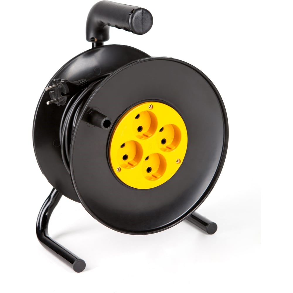 Удлинитель на катушке УС-4-30 ПВС 2х2,5 3500Вт 16А 4гн 30мпредставляет собой катушку из пластика диаметром 240 мм с намотанным проводом, оснащенным четырьмя розетками. Катушка - это удобное приспособление для защиты длинного провода от спутывания, его хранения и транспортировки. Удлинитель на катушке используется на строительных площадках, в производственных цехах и бытовых условиях, позволяет присоединить несколько электрических приборов одновременно. Удлинитель на катушке необходим там, где осуществляется работа с электрическим оборудованием, находящимся на большом расстоянии от сети электропитания. На корпусе катушки располагается устойчивая подставка и специальная рукоятка для удобства переноски удлинителя.