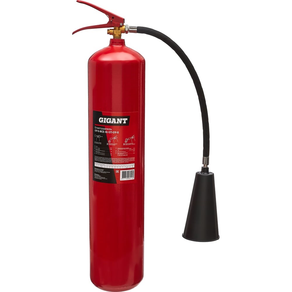 Углекислотный огнетушитель Gigant ОУ-5-ВСЕ-01 GT-ОУ-5 – закачной огнетушитель высокого давления с зарядом жидкой двуокиси углерода, находящейся под давлением жидких паров. Применяется для первичного тушения пожаров и возгораний класса B, C, E (горючие и легковоспламеняющиеся жидкости, горючие газы, электроустановки, не превышающие напряжение 10000 Вольт). Основным преимуществом углекислотного огнетушителя является то, что двуокись углерода не повреждает объект тушения и не оставляет следов.