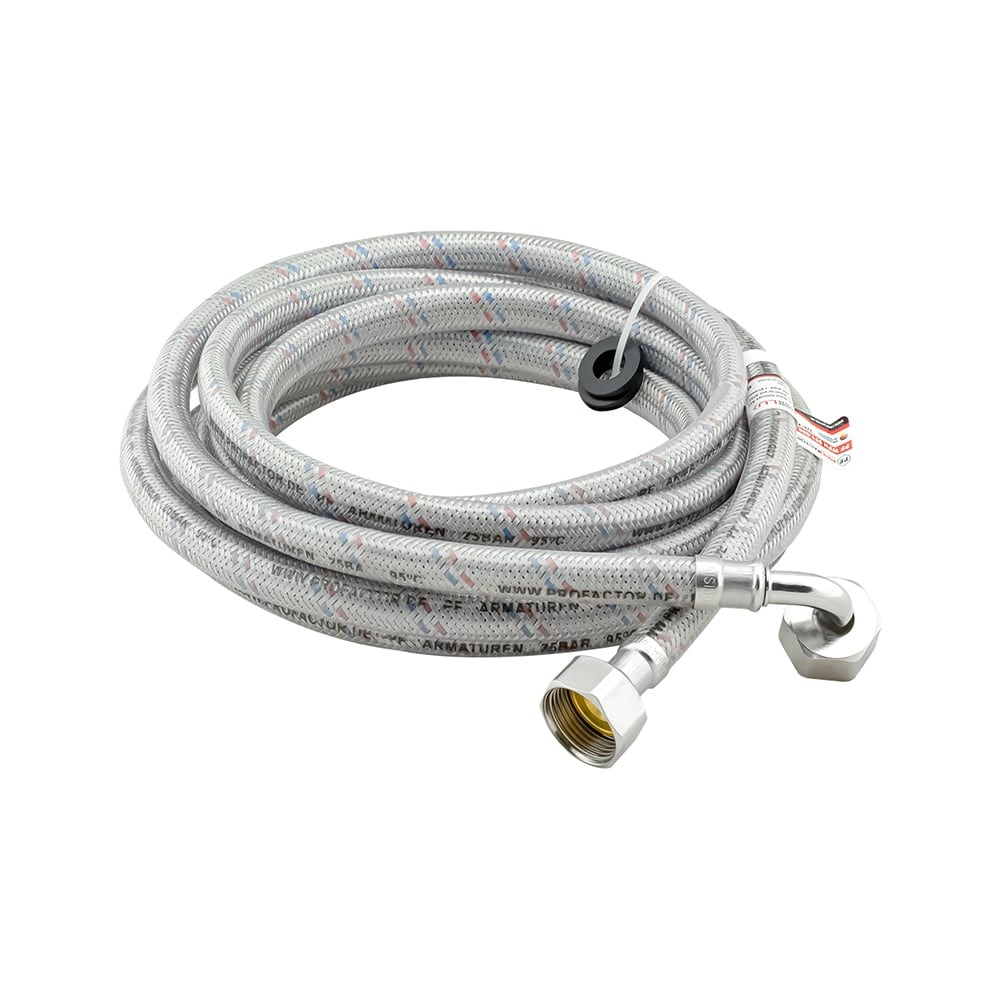 Гибкая подводка с угловым присоединением PROFACTOR® LUXE для стиральных машин применяется для подведения воды к агрегатам бытового назначения (водонагревательным приборам, стиральным и посудомоечным машинам, и т.д.). Подводка имеет угловое присоединение — что является лучшим решением при подключении сантехнических приборов в условиях ограниченного пространства Внешнее расстояние присоединенной подводки до плоскости стены всего 37мм. Мощные гайки из нержавеющей стали AISI 201 гарантируют надежность в зоне присоединения при ее монтаже и эксплуатации Термостойкое полимерное покрытие осуществляет защиту от негативных воздействий внешней среды, продлевая срок службы изделия, препятствует образованию конденсата, способствует поддержанию пространства для инженерных коммуникаций в чистом и сухом состоянии Внутренний шланг выполнен из экологически чистого материала EPDM, что даёт возможность использования данной подводки для питьевой воды Материал фитингов и оплетки шланга: нержавеющая сталь Наружный диаметр подводки: 14,4мм Прочность на разрыв: 80 — 130 бар Минимальный радиус изгиба шланга при монтаже: 75мм Пропускная способность: 33 л/мин при давлении 3 кг/см² Рекомендуемое усилие при затяжке гайки: до 4 Н/м